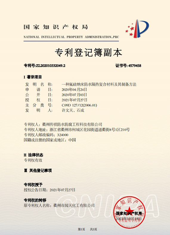 衢州傳祺新材料科技有限公司是衢州市聞天化工有限公司的下屬企業;衢州市聞天化工有限公司成立于2003年,是國內最早研發、生產氟碳涂料的企業之一。衢州傳祺新材料科技有限公司成立于2017年,公司專注于高分子氟材料的開發和含氟材料在防腐、防水領域的應用。經過6年的不懈努力,已獲得了化工和建筑領域六項國家發明專利授權和兩項新產品科技成果獎,參與了中國建筑材料流通協會《房屋修繕防水工程規范》標準的編制工作,中建協涂裝委員會浙西工作站設立在我公司。